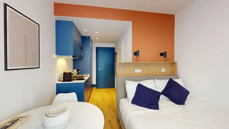 Each apartment includes a comfortable bed, storage space, a private bathroom, and a kitchen.